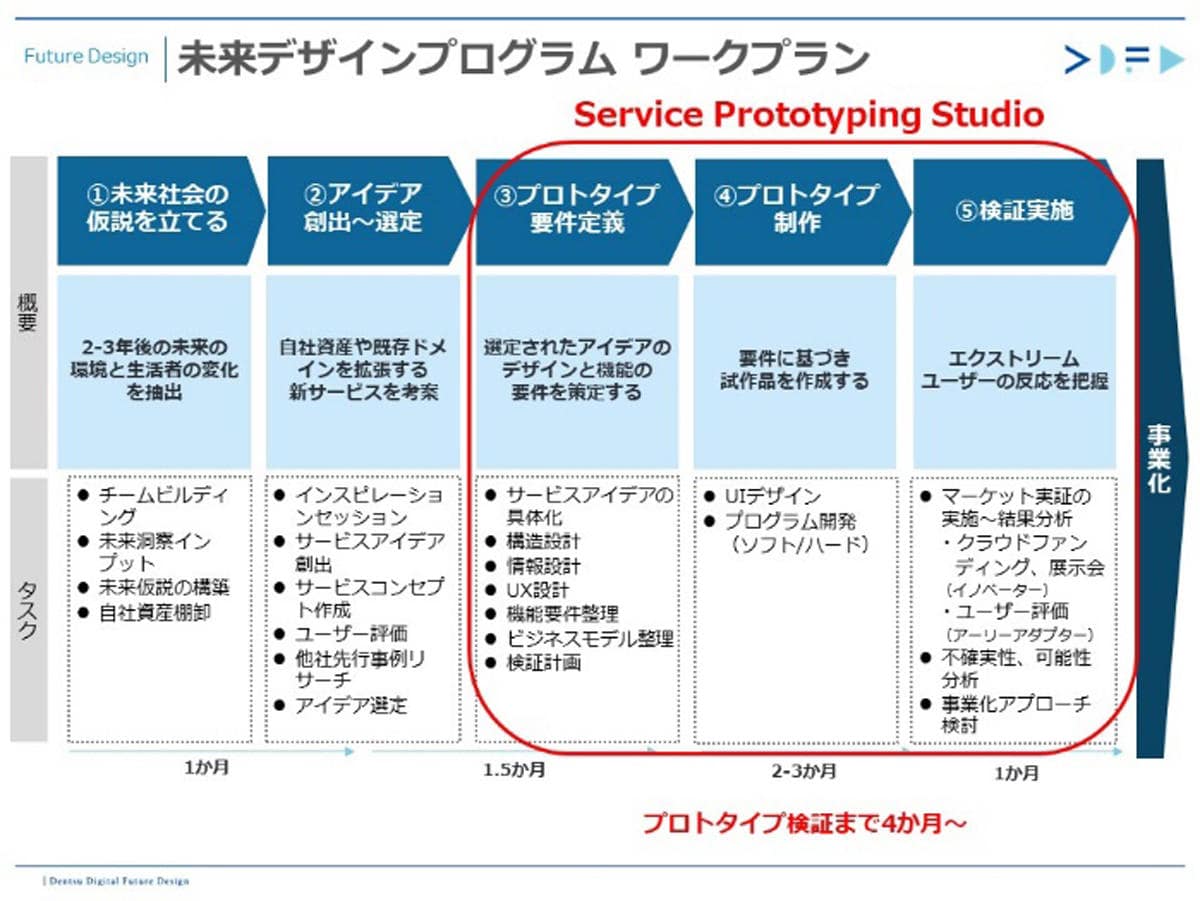 このワークプランの③~⑤の段階に相当する「Service Prototyping Studio」は、プロトタイプのアイデアを具現化、制作、検証を、4カ月ほどで実施します。