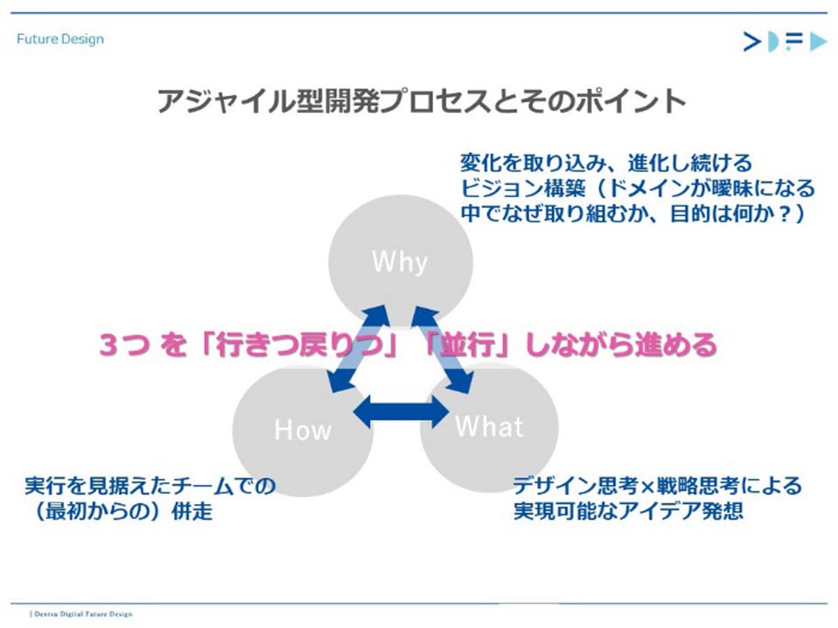 「Service Prototyping Studio」の大きな特徴は、数年後から10年後の未来を見据えたビジョンを構築する「Why」、デザイン思考×戦略思考による実現可能なアイデア発想の「What」、そして実行に向けた外部パートナーとの連携である「How」という、3つの事業開発プロセスをアジャイル(すばやく)に回すところにあります。