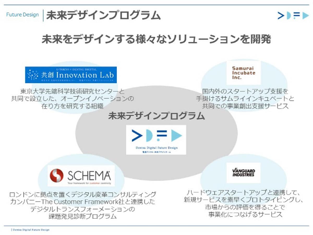 サービスデザイングループでは、ハードウェアスタートアップ企業であるVanguard Industriesと連携して提供している「Service Prototyping Studio」のほか、外部の学術機関やインキュベーション事業会社などと連携したソリューションを用意しています。