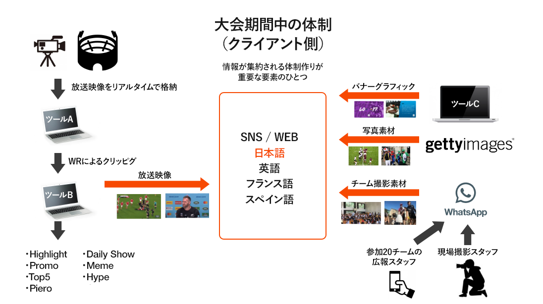 タイムリーで柔軟なソーシャルメディア投稿を支える体制が組織化できた背景について、河原井氏は、「大会参加規定のうち12ページ分がソーシャルメディア関連のことだった。参加チームには事前に『やってほしいこと、やってほしくないこと』を伝えられていた。試合は素晴らしいものになるとわかっていたが、それ以外にも感動・共感できるストーリーが多く存在することは分かっていたので、それを伝えられるよう、各チームのマネージャーとWhat's UPで繋がって『出せるエピソード』をもらっていた」とし、本大会の公式アカウントがここまで活発に運用ができた理由のひとつは、「ラグビーW杯のグローバルマーケ担当者の存在が大きい。コアファンとライトファンのどちらにも情報を伝えることがスポーツ好きを広げるきっかけになる、と言ってくれていた。本当に感謝している」とした。