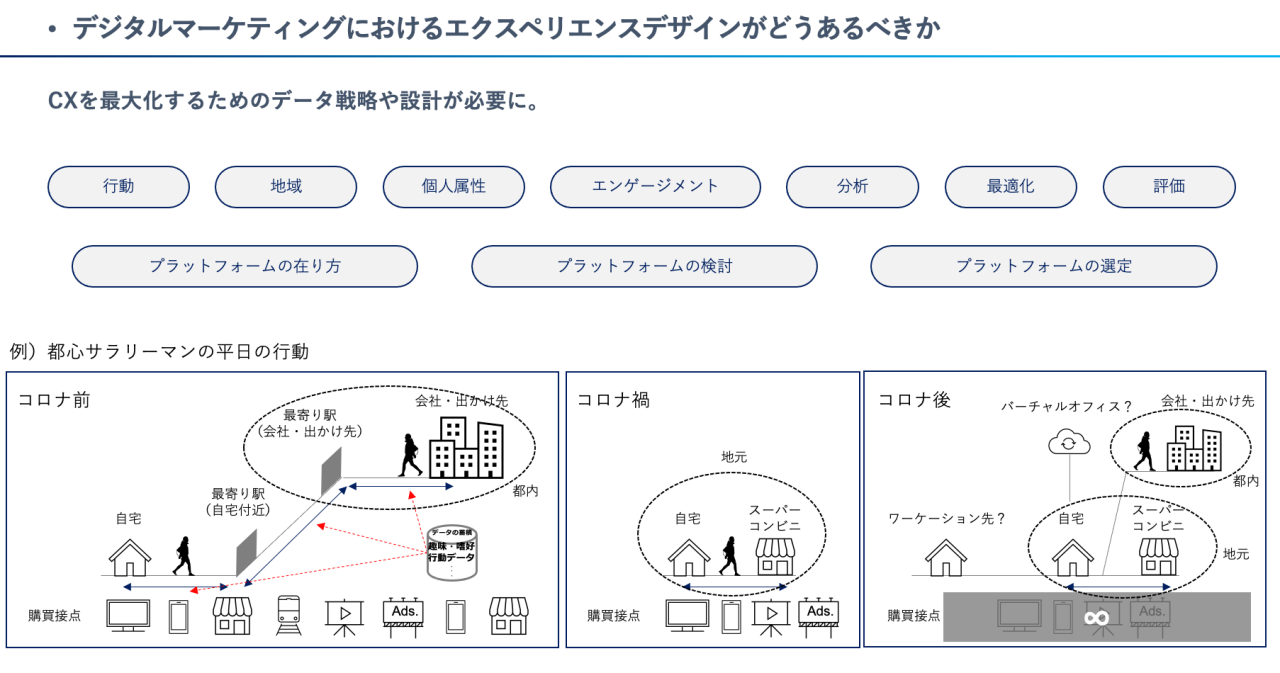 例えば、都心のビジネスパーソンたちの平日の行動を、コロナ前、コロナ禍、コロナ後で整理すると、行動や購買接点が変化していることが分かります。
