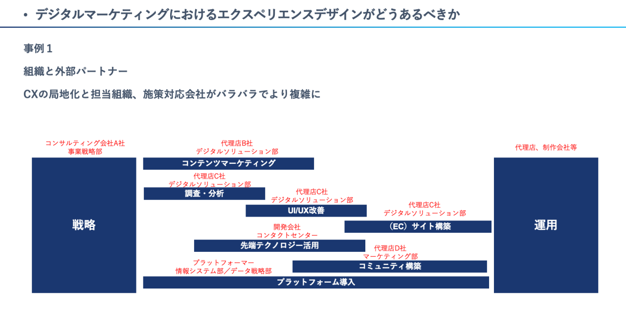 戦略ではコンサルティング会社A社と事業戦略部、コンテンツマーケティングでは代理店B社とデジタルソリューション部、UI/UX改善では代理店C社とデジタルソリューション、プラットフォーム導入ではプラットフォーマーと情報システム部、データ戦略部といったように、CXの設計が局地化して担当組織、施策対応会社がバラバラになっていきます。