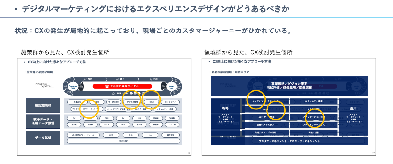 デジタルマーケティングにおけるエクスペリエンスを考えるときには、マーケティングやデータ戦略も忘れてはなりません。体験設計に注力するあまり、マーケティング・データ戦略がおざなりになってしまうことにしばしば出くわすことがありますが、体験の文脈とあわせて検討していく必要があります。