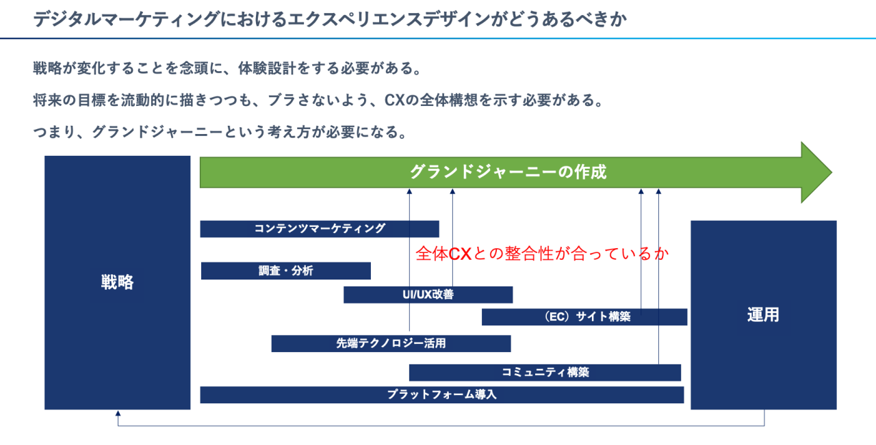 このような場合、戦略が変化することを念頭に、将来の目標を流動的に描きつつ芯はブレないよう、CXの全体構想を示す必要があると考えます。つまり、グランドジャーニーという考え方が必要になる、といえます。