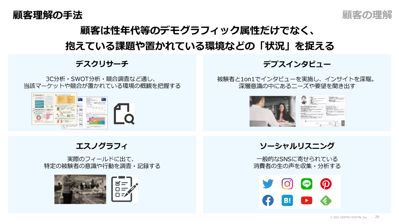 顧客理解の手法には、デスクリサーチ、顧客へのデプスインタビュー、エスノグラフィ(行動観察調査)、ソーシャルリスニングなどがあります。これらの定性的な顧客理解では、「なぜ」を深掘りすることが大切です。その人が抱えている課題、置かれている環境といった状況を捉え、「なぜそう考えたのか」「なぜそう行動するのか」を深く考察するのです。