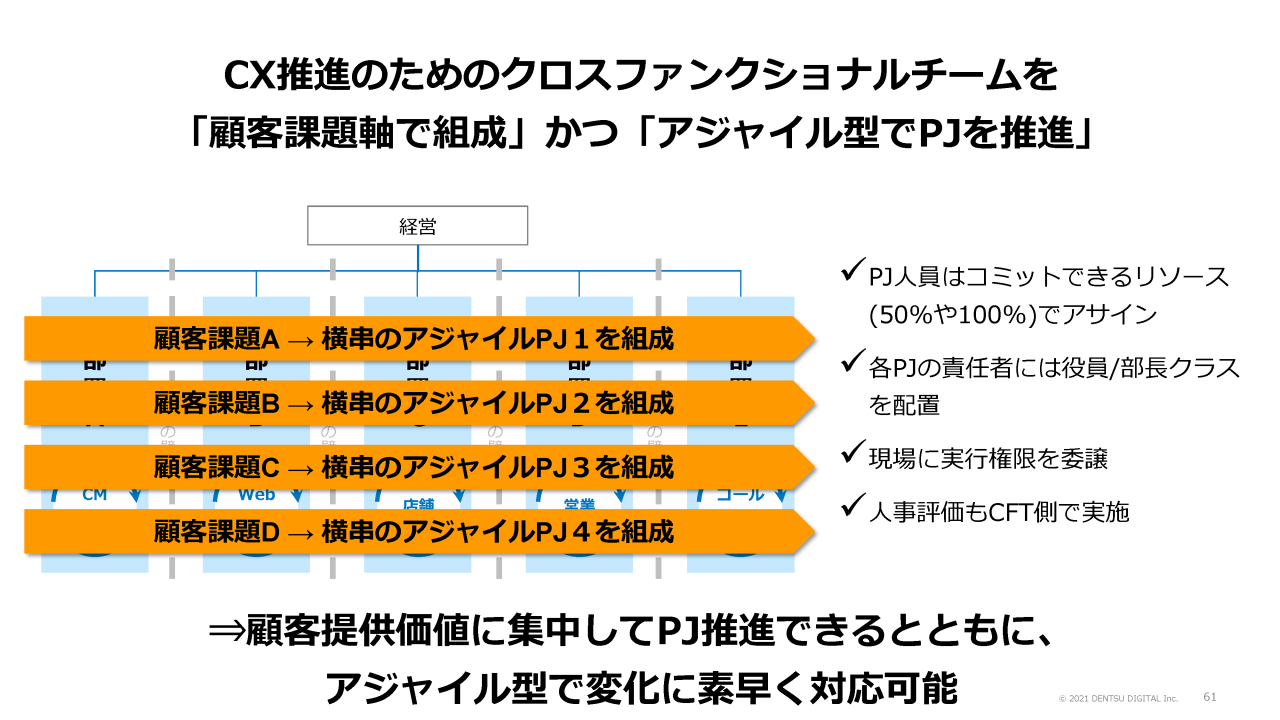 各プロジェクトの責任者には役員や部長クラスを配置し、アジャイルに動けるよう現場に実行権限を移譲しています。そして、人事評価もクロスファンクショナルチーム側で行います。これにより、真に顧客への提供価値に集中してプロジェクトを推進することが可能になります。