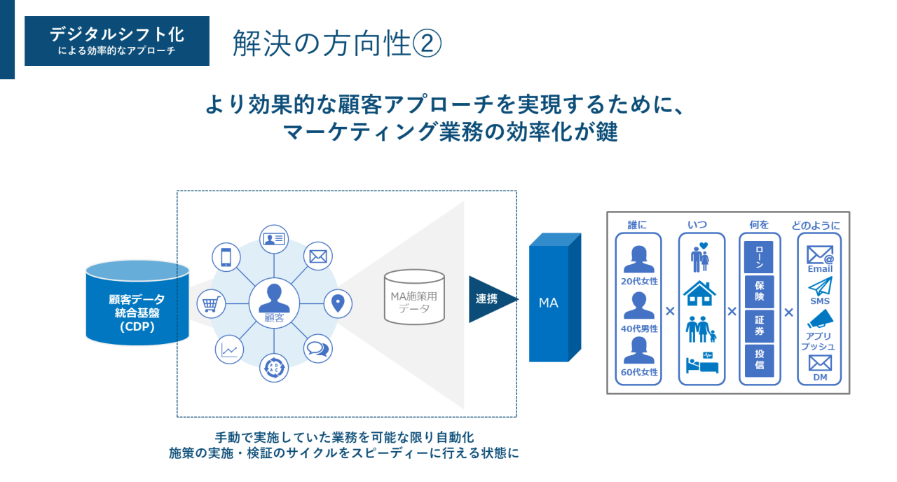 2つ目は「デジタルシフト化」。顧客のニーズや状況に合わせて、デジタルと店舗の両チャネルを活用し、効率的なマーケティングを実現することです。