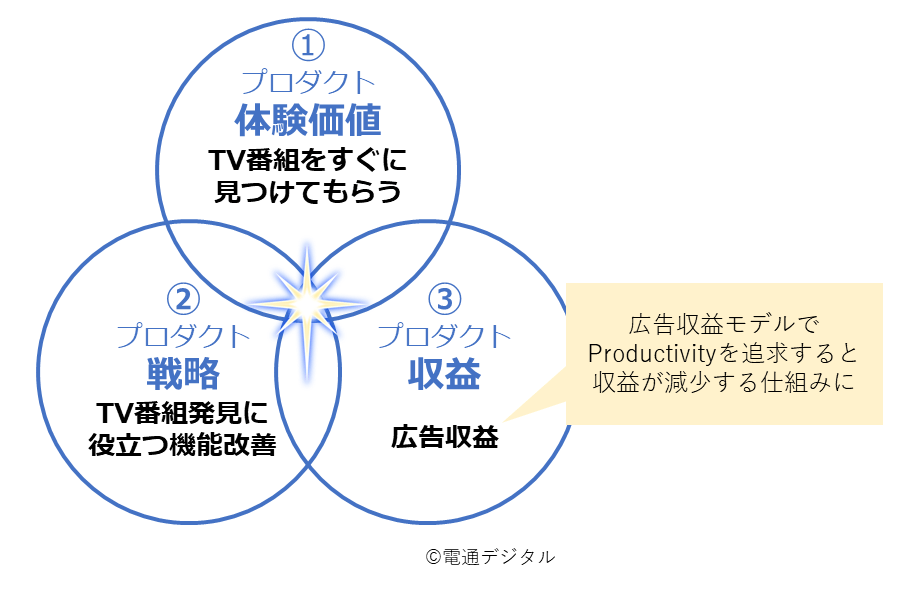 「テレビ番組に関連したコンテンツを楽しんでもらう(=Attention)」と「テレビ番組をすぐに見つけてもらう(=Productivity)」のどちらでも大丈夫な感じもするが、じつは「テレビ番組をすぐに見つけてもらう(=Productivity)」を選ぶと、North Star Metricの3要件のうち、「収益」に不都合が生じる。その理由を見ていこう。
