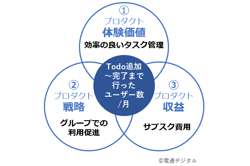 「体験価値」を設定したら、次は前回の記事で紹介したように、3要素が重なる部分を見ながら、North Star Metricを決めていくことになる。今回の3要素は以下のとおりだ。