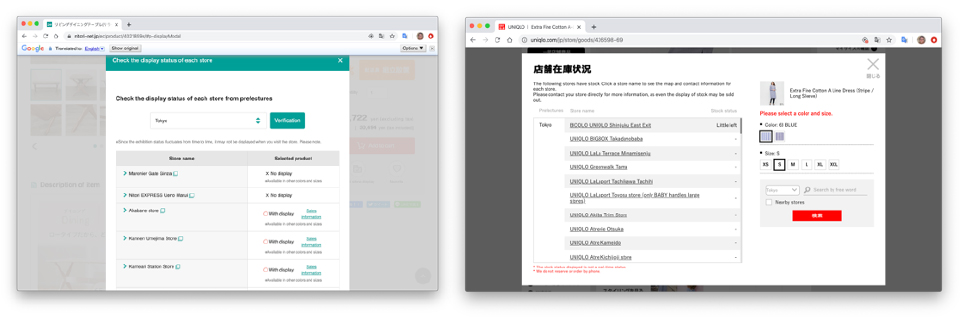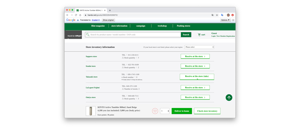 もう少し透明性の高いアプローチでは、顧客が店ごとに在庫確認できるようにします。多くの場合、在庫情報は購買のボタンと共に出されます。