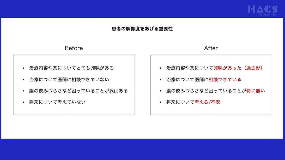 HACSではこれまでヘルスケア領域のみなさんが培ってきたアプローチの仕方や医師・MRの方々の視点を取り込むことの重要性を十分に理解しています。同時に、患者を中心にしたコミュニケーション同様、医師やMRを中心にしたとしても、彼らを一くくりに考えるのではなく、どのようなニーズやインサイトがあるのか、丁寧に紐解くことが重要だと考えます。