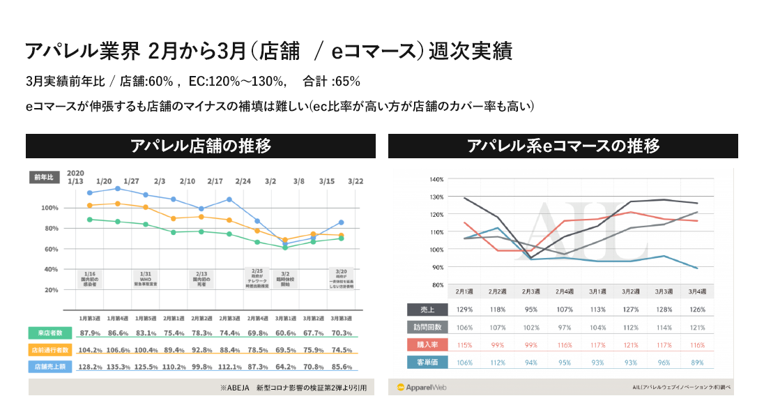 アパレルのEC化率は前年度平均11%なので、この11%が売り上げ5%押し上げに貢献したと考えられるが、EC化率20%以上のブランドだけを抽出して見てみると、eコマースによって15%ほど総売り上げを押し上げた、との結果も見られる。やはり、eコマースの比率が高いほど店舗の損失を補填できる可能性がある、と言えそうだ」。