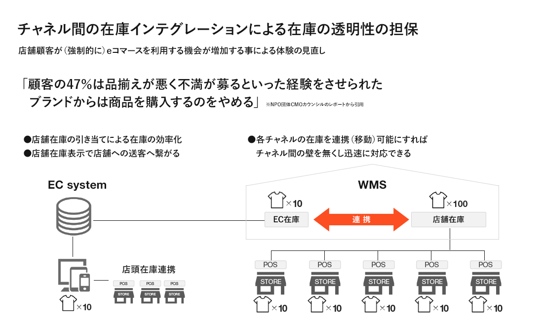 続けて、在庫管理の重要性について、「店舗とeコマースのショップでの在庫数をきちんとインテグレートさせて管理することで、顧客は買うモチベーションが保たれてCXは向上する。一方、事業者側も販売機会の損失を避けられる」とし、「各チャネルの在庫連携が可能になれば、『店舗にはないけど、eコマースで購入できる』など、チャネル間の壁をなくし、迅速な対応が期待できるだろう」としました。