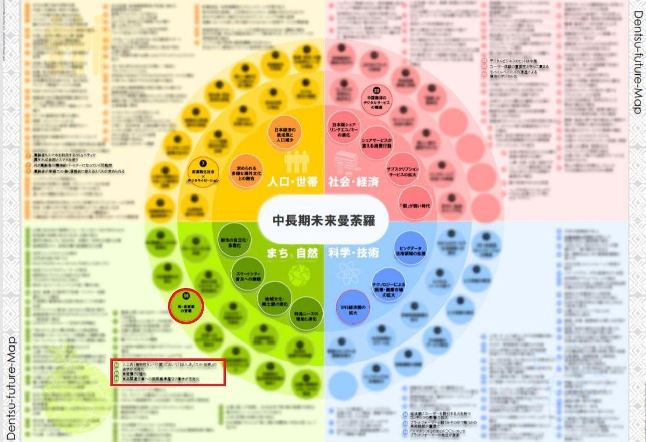 「未来曼荼羅」は、2010年、10年先に通用するような製品開発のため、未来に起こりうる事象をまんべんなく検討すべく、電通のマーケティングチームによって作られました。その時すでに「未来曼荼羅」という名称があてられており、そのまま引き継がれて今に至っています。