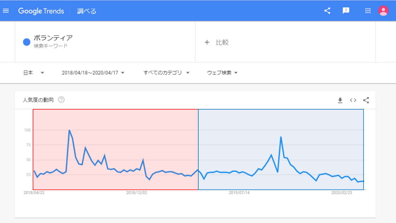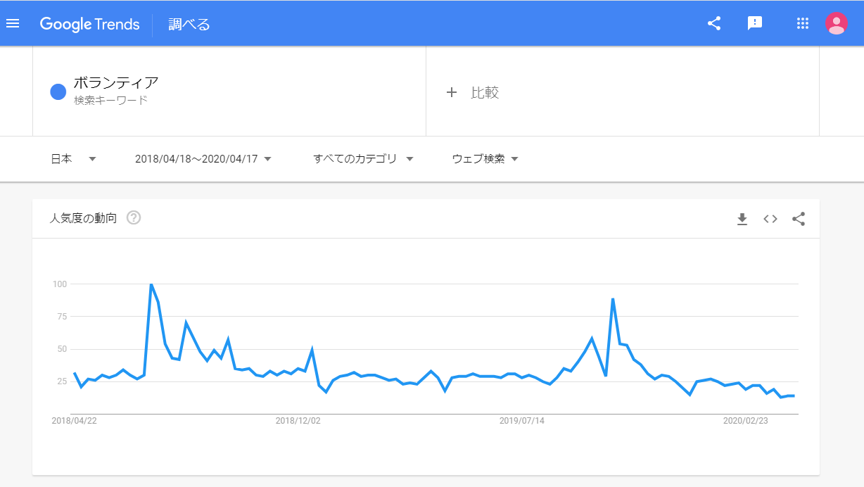 本節では、需要の具体例を説明するために「Google トレンド」を活用します。その読み解き方の説明も兼ねて、まずは「ボランティア」の検索需要(直近2年分)を確認してみましょう。以下のようなグラフが表示されるはずです。