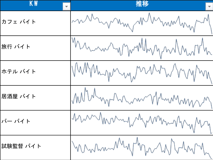 検索需要調査を、業界やテーマに関わる主要キーワード全般に対して行うことで、業界別の需要動向をうかがい知ることができます。以下は、アルバイト関係でコロナによる需要が伸びたキーワードの一例です。「家でできるバイト」「デリバリー需要の増加で求人が増える、宅配系のバイト」「人手不足が報道されることが多い、小売店でのバイト」などの検索需要が増加しています。