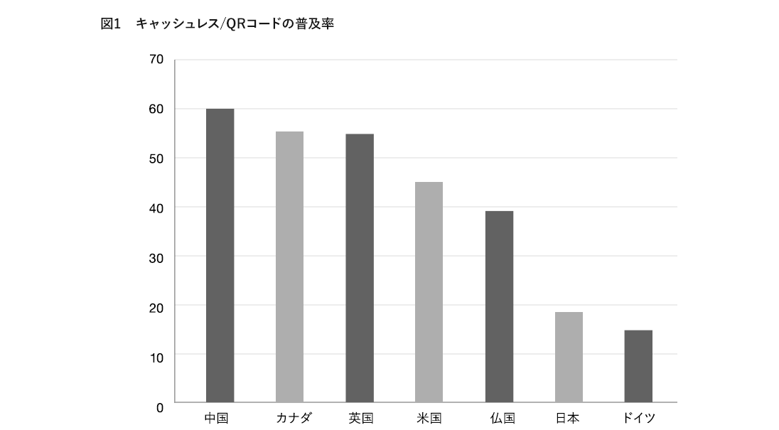 深センでは、地下鉄、自動販売機、タクシー、ホテル、レストラン、屋台、ゲームセンター、1人カラオケに至るまで、ありとあらゆるサービスがモバイル決済を前提に設計されていました。現地で現金を持ち歩いている人はほとんどいません。先進国の中でもキャッシュレスの普及率は、60%と世界で一番普及しています。(図1)
