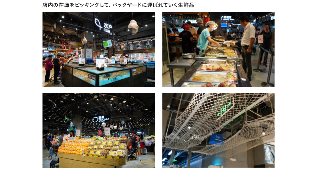 ニューリテールの代表的なビジネスモデルであるフーマーフレッシュはアリババが提供する成城岩井や紀伊國屋のような高級スーパーで、生鮮品の宅配を行っています。 深セン市内であれば注文してから30分以内に届けるサービスとフードコートは生簀の魚を即調理し、屋台のようなライブ感が味わえるような店舗作りが特徴です。特に宅配はスーパーに陳列してある商品を店頭在庫にみたてて、注文が入ってから店員が商品をピックアップして、天井にピックアップされた商品がクレーンで吊り下げられて、バックヤードに運ばれるのが印象的でした。