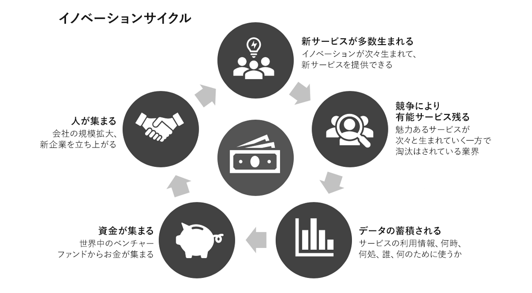 以上のように、モバイル決済を起点とし、様々なサービスがうまれています。新しいサービスは、激しい競争により優れたサービスだけが残り、かつオンラインとオフラインのデータがデータベースに蓄積されます。このデータを分析し、更に良いサービスのアイデアがうまれます。そして、企業はベンチャーファンドにより資金を調達し、資金が集まれ人材を集めることができます。人材が集まれば新しいイノベーションがうまれます。