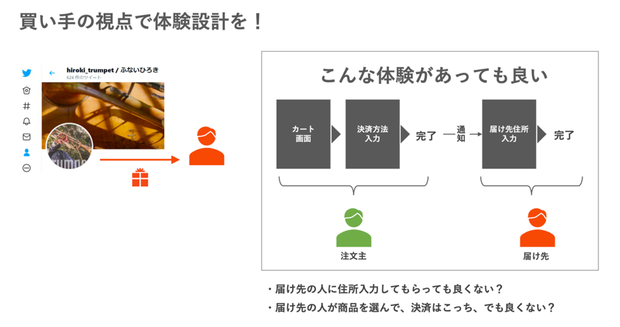 しかし、そう思ったとしても、一般的なeコマースの“常識”では、カートに商品を入れ、お届け先住所を入力し、決済方法を入力して完了というステップを踏まないと注文を確定できない。つまり、個人情報を知らない相手にはプレゼントを贈れない、というわけだ。これは、顧客の側からすると残念に感じる体験だと言えるし、昔から変わらないeコマースの常識では今日の顧客のニーズを満たせない場合がある、ということを教えてくれてもいる」。