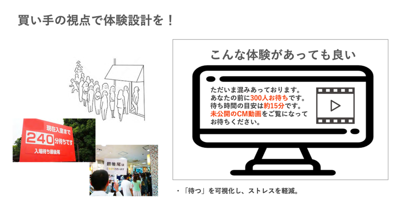 「店舗で行列を待つように『ただいま混み合っております。あなたの前には300人が待っていて、およそ待ち時間は15分です』と待ち時間を可視化できたら顧客はどう思うだろうか?