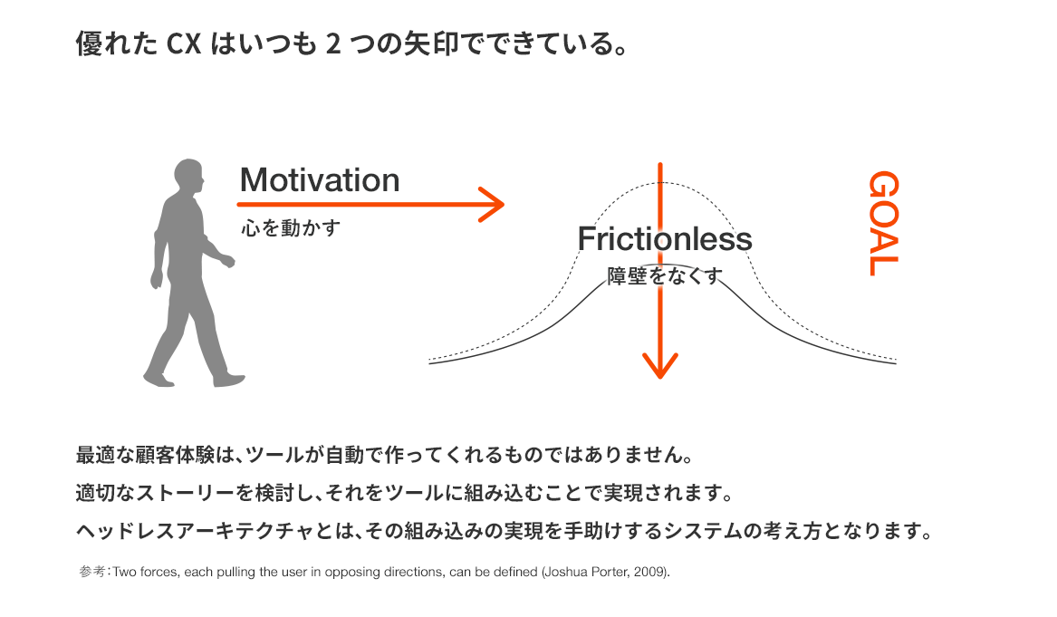 この問いに対し、電通アイソバー(現 電通デジタル)では下図を示し、「優れたCXはいつも、心を動かしゴールに導くMotivationと、ゴールに向かう際の障壁を排除して徹底してつまずきを無くすFrictionlessの2つの矢印でできている」とお伝えしています。