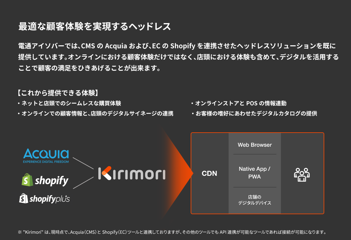 前述のような利点をもたらすヘッドレスソリューションは、今日eコマースを実践する企業から非常に関心をもって見られているものです。そうした流れを受けて、クライアント企業様が柔軟な顧客体験を実現できるよう、電通アイソバー(現 電通デジタル)では「Kirimori」というヘッドレスソリューションを開発しました。