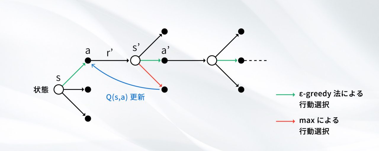 上述のSARSAの方策に、ε-greedy法を適用したものがQ-Learningです。Q-Learningは、方策オフ型のT D制御を特徴とするアルゴリズムです。Qラーニングにおいては、価値更新に用いるために用いられる行動と実際の行動が異なっていることに注意が必要です。価値更新に用いられる値はmax関数により選択されます。