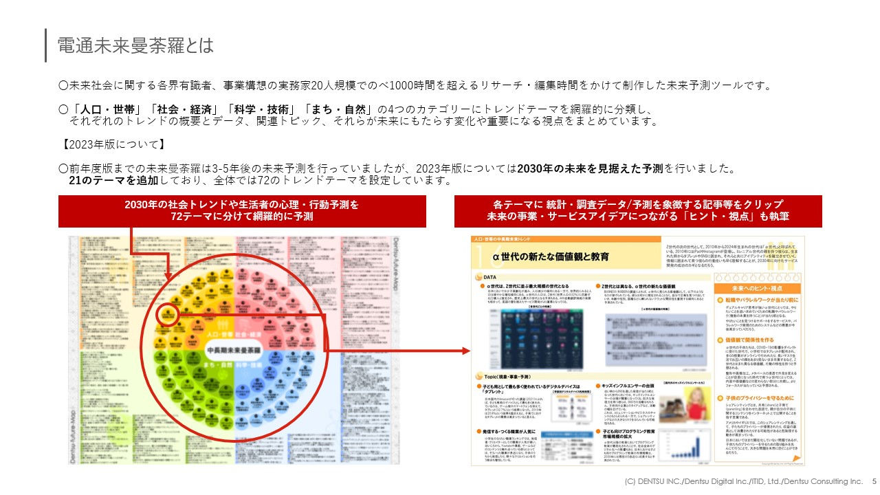 これまで、多くのクライアント企業の未来起点の経営戦略立案や新規事業、サービス開発に活用されてきた「電通未来曼荼羅」。2023年4月に改訂を行い、2030年を見据えた中期未来予測ツール「電通未来曼荼羅2023(以下、未来曼荼羅2023)」としてリリースされました。