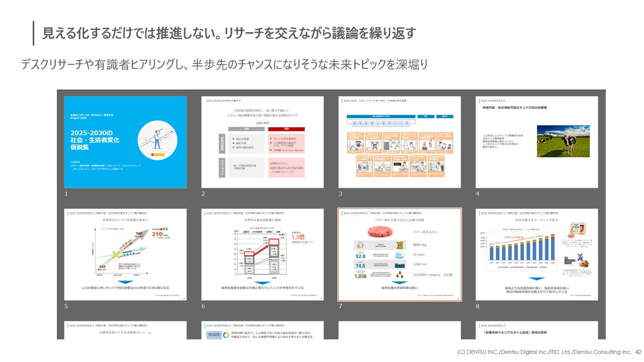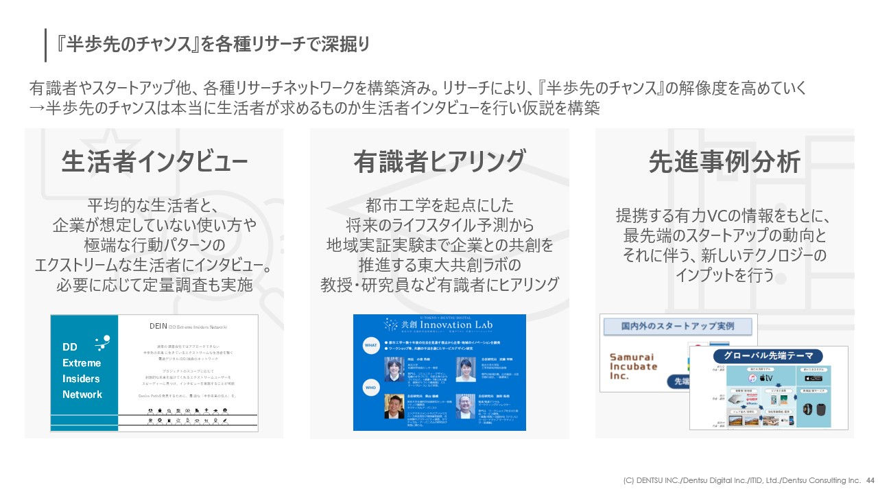 さらに、見つけた「半歩先のチャンス」は、生活者インタビュー、有識者へのヒアリング、ディスカッションを繰り返し、より解像度を高めていきます。このプロセスを繰り返し行うことで、仮説だけでもかなりの数が出てくるはずです。