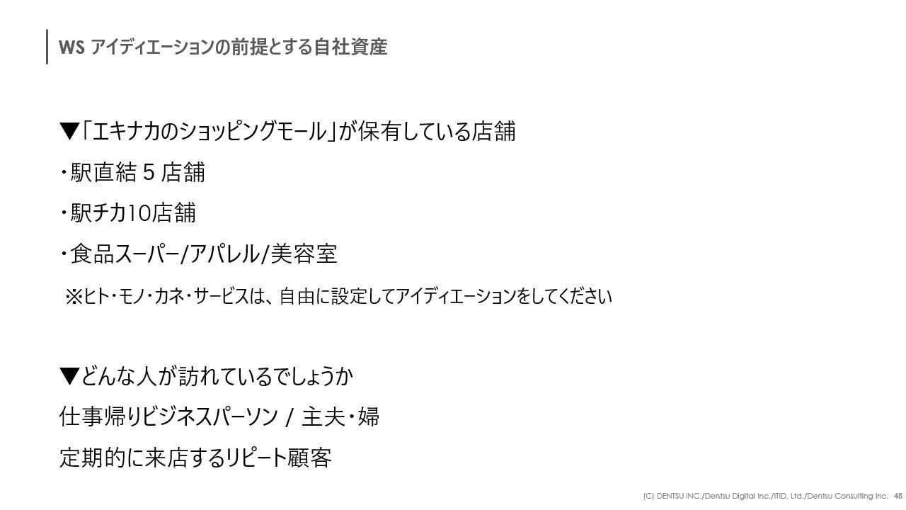 高橋:ディスカッションテーマは、「駅ナカのショッピングモールはどうしたらもっと愛されるか?」です。下記の設定を踏まえて、この仮想クライアントA社に関わる未来の見立てを行っていただきます。