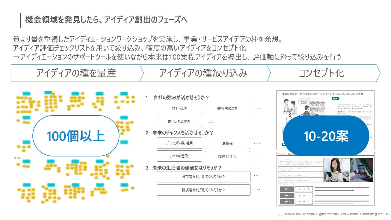 出てきたアイデアは、最終的にアイデア評価チェックリストで絞り込み、確度の高いアイデアをコンセプト化するという流れで進めます。