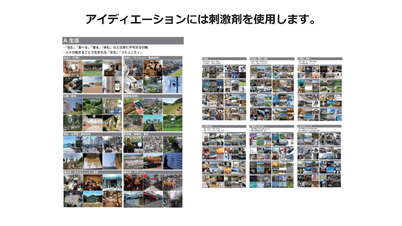 高橋:「普段アイデアを考える業務に就いていない人が、100個も考えられるものなのか? 」と思われるかもしれませんが、アイディエーションの際には、様々なツールやテクニックなどのアイデア刺激剤を使って、発想を広げたり、深めたりできるように工夫しています。