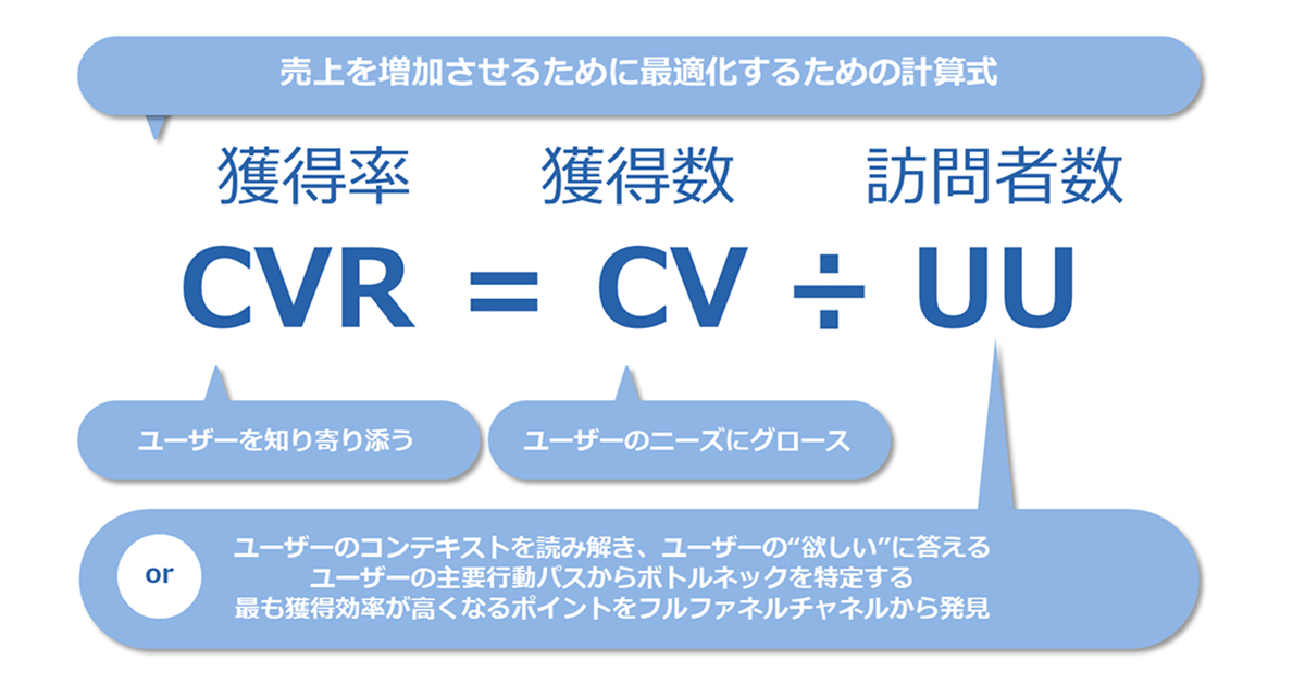 まずは②のCROでCVRをある程度改善する。その上で、費用対効果を推し量りながら、①を状況に応じて実施し、少しずつ売り上げを増やしていくことが重要です。CVRとCV、UU(訪問者数)の関係を表す計算式は以下のとおりです。