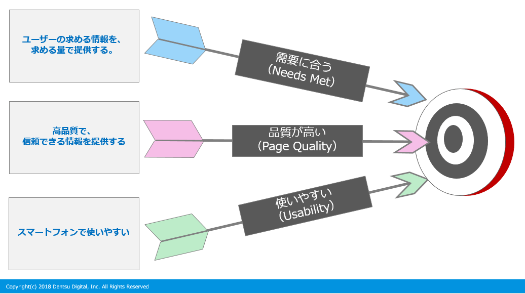 「ユーザー需要との一致」「コンテンツの品質」「使いやすさ」などについて、Google の理想・価値観を、とても具体的に示しています。「SEOの目標」を定めていると言い換えてもいいでしょう。
