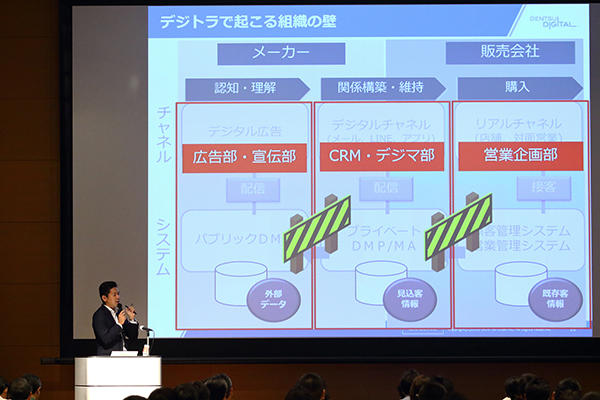 第1に魚住が指摘したポイントは「組織の壁を乗り越える際にはデータ循環がカギ」。今ではメーカーや販売店という組織を超えてシステムやデータ、業務がつながっている産業が多い。その中でデジタルマーケティングを遂行しようとすれば、デジタル広告を仕掛ける広告・宣伝部、ユーザーとの関係を構築し維持するCRM・デジタルマーケティング部、リアルチャネルでの販売を支援する営業企画部といった3つの部署が関わることになる。