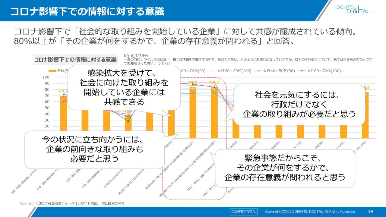 もう一つ。これは電通が4月に調査した結果ですが、生活者の方に、「コロナ影響下での情報に対する意識」について聞きました。回答の中から、スコアの高いものをピックアップしてみました。
