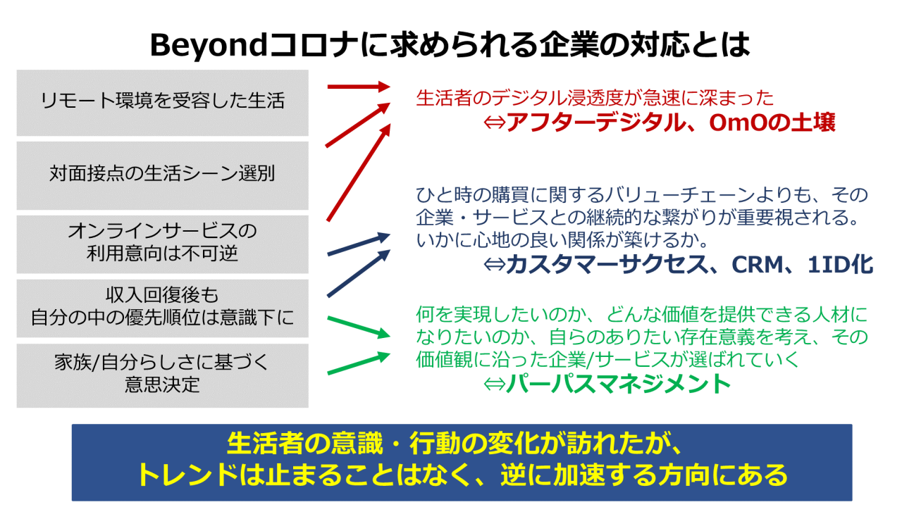 小浪 : コロナによって生活者のライフスタイルや行動様式は大きく変化しました。企業としても自社をどのようにDXしていくべきか、考えなくてはいけません。大きな傾向としては、最初に紹介したアフターデジタル、OMO、カスタマーサクセス、さらにはCRM、1ID化、パーパスマネジメントといったDXのトレンドはとどまることなく、逆に加速する傾向になると考えて良いかと思います。