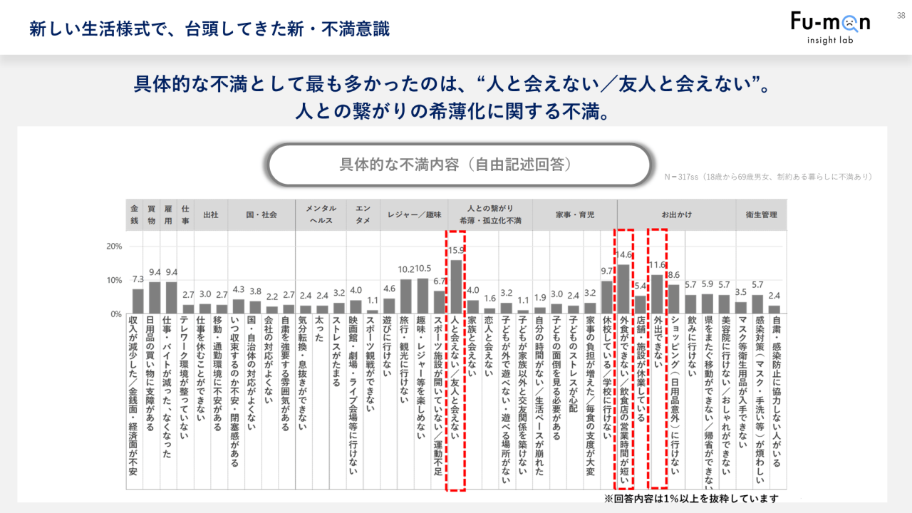 では、企業は生活者のどんな不満を察知して、次なる競争優位を作っていくべきなのでしょうか。Fu-man insight lab™の調査によると、具体的不満としてもっとも多かったのは、「人や友人と会えない」といった、人とのつながりの希薄化に関する不満でした。