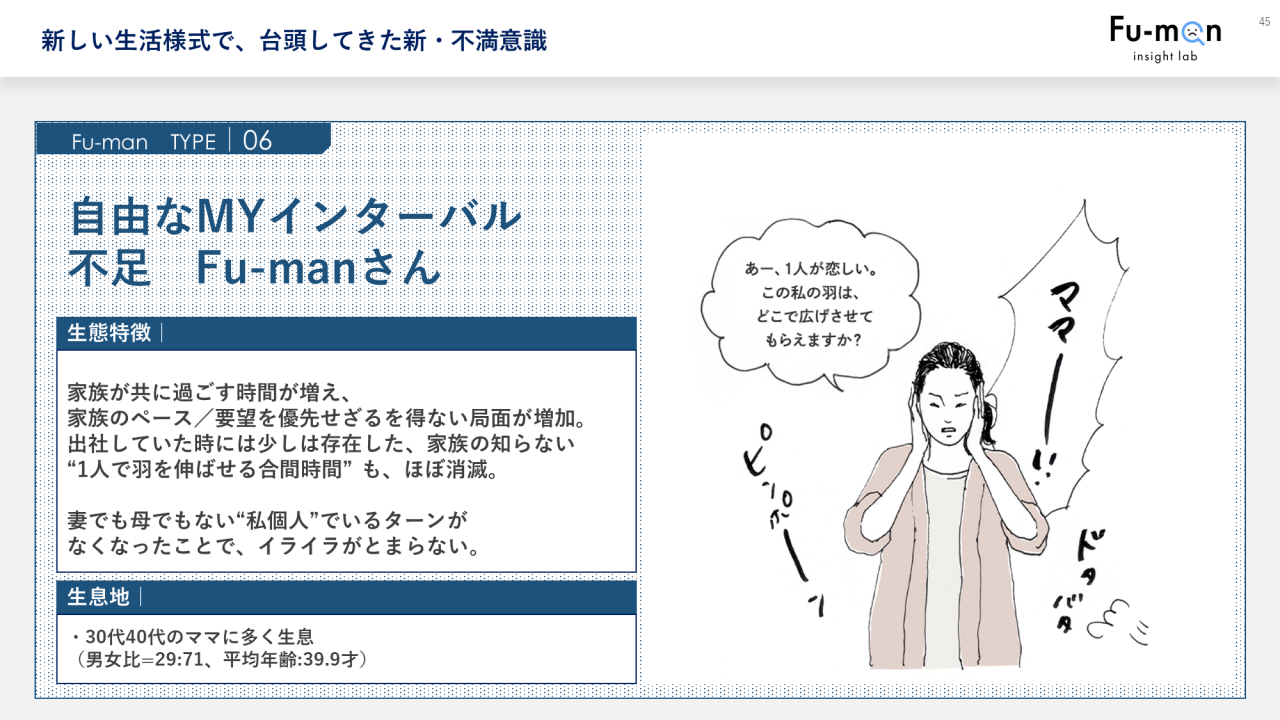 タイプ5は「わが家の新・ルール順応疲れFu-manさん」です。コロナによって家族全員のライフスタイルが急変してしまい、食事や掃除、洗濯、教育など、これまで築いてきたわが家のルールが崩壊。わが家の新しいルールを確立していくことに不満を抱え、心身の疲れを募らせています。30代、40代の専業主婦に多く生息しています。