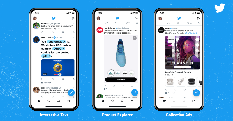 商品コレクションを提示できる広告で、1つのプロモツイートの中に、1つのヒーローイメージと最大5つの画像と説明を掲示できます。新しい商品との出会いのきっかけを提供します。