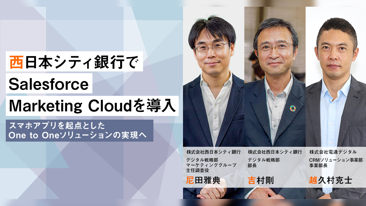 本稿では、Marketing Cloud導入の背景と目的、ツール選定で考慮したポイント、開発経緯と今後の展望について、西日本シティ銀行 吉村剛氏、尼田雅典氏と電通デジタル 越久村克士にお話を伺いました。