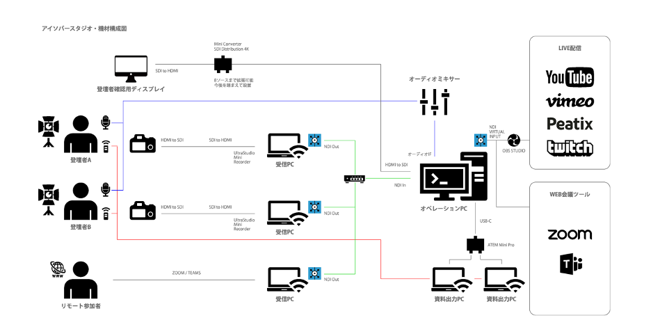 例えば、機材やケーブル、ソフトウェアの繋ぎ込みでは、理論上は上手くいくと考えられるのだけれど、実際に繋げてみると上手くいかない、ということが度々起こります。“相性が悪い”というわけです。そうしたことを理解した上で対処しているのがプロの技とも言えるでしょう。実は、“きちんと配信できるシステム”を構築するのが一番大変なことなのです」と、口を揃えます。
