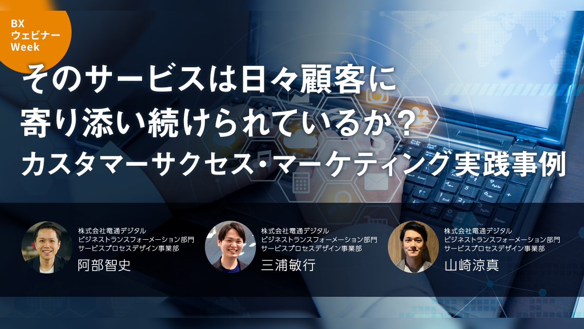4日間に渡った最終日である6月25日の2回目は、電通デジタル ビジネストランスフォーメーション部門 サービスプロセスデザイン事業部の阿部智史、三浦敏行、山崎涼真が登壇。このウェビナーでは、電通デジタルのBtoC、BtoB企業担当者が、顧客の成功を支援する「カスタマーサクセス」アプローチで、どのようにコミュニケーションの断絶やペインの解消を行ったか、その実践方法について事例を交えながらご紹介します。