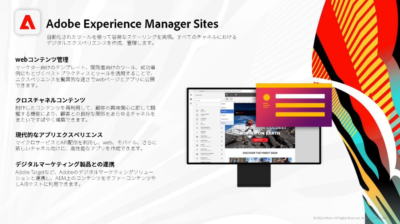 コンテンツ管理に関しては近年ヘッドレスCMSが話題ですが、CMSのAdobe Experience Manager Sitesは、APIファーストでヘッドレス型のコンテンツも容易に配信可能です。