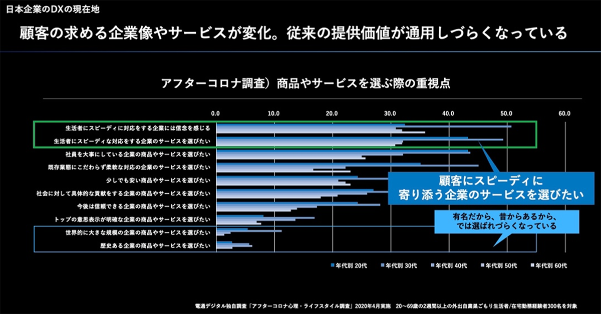 同社が実施した意識調査によると、顧客がサービスを選択する際の基準がコロナ禍をきっかけに大きく変化しており、モノやサービスのブランドや知名度、あるいは価格よりも、スピーディにかつ柔軟に要望に対応してくれるかが、より重要視される傾向にシフトしているというのだ。