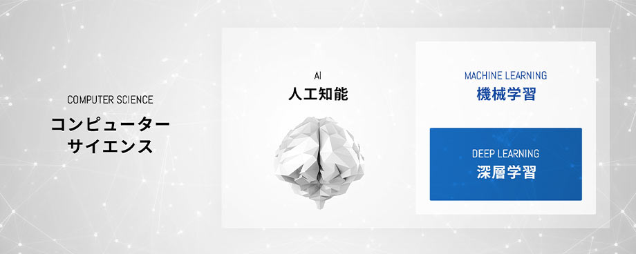 AIはコンピューターサイエンスの一分野で、機械学習はその中の一分野となり、ディープラーニング(深層学習)はさらにその機械学習の中の一分野にあたります。AI(人工知能)>機械学習>ディープラーニングのような位置づけで表します。