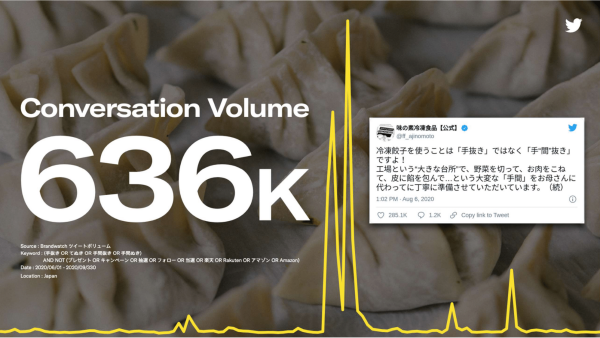 2020年夏、「冷凍餃子を食卓に出すのは手抜きだ」というツイート[4]に対し、味の素冷凍食品公式アカウントが、「冷凍餃子を使うことは『手抜き』ではなく『手“間”抜き』ですよ!」[5]と発信したところ、多くの反響があり、「冷凍食品は手抜き? 手間抜き?」論争が始まりました。