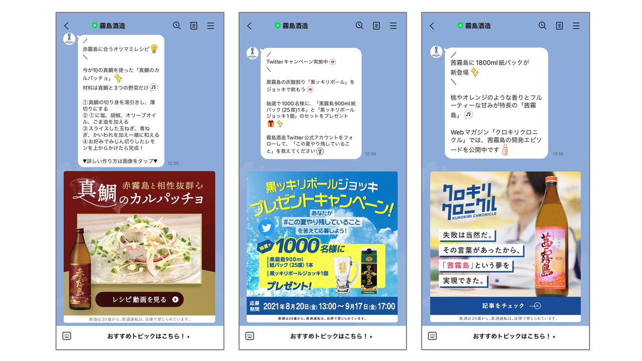大久保(霧島酒造):プラットフォームの運用体制は今後も引き続き整備していく必要はありますが、社内の変化は既に強く感じています。というのも、過去に大型キャンペーンを実施しても、応募いただいた方との接点はその1回限りで、継続的なつながりは持てていませんでした。「〇〇のキャンペーンに応募した人」という情報しか把握できていなかったのです。そこからMAを導入し、LINEやメルマガと連携して継続的なコミュニケーションを実現。今ではLINEやSNS、メールマガジンなど、各デジタルチャネルを活用した小規模なキャンペーンを年に複数回行うようにしています。