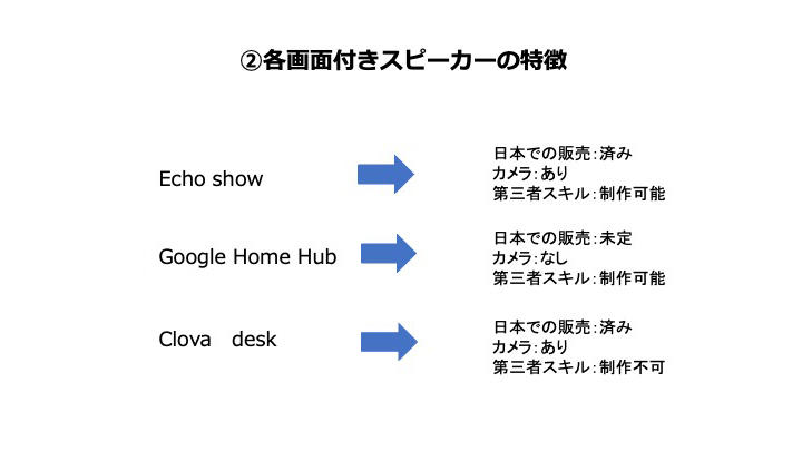 次は、各画面付きスマートスピーカーの特徴に関してです。泰良は「Google Home Hubは、プライバシーの観点からカメラなしの判断をしたようです。また、Amazon EchoとGoogle Home Hubに関しては、第三者である他の企業や個人がスキル開発するためのガイドラインが整備されています。Amazon Echoはガイドラインに加え、開発キットをテンプレート形式で提供しています」と説明します。